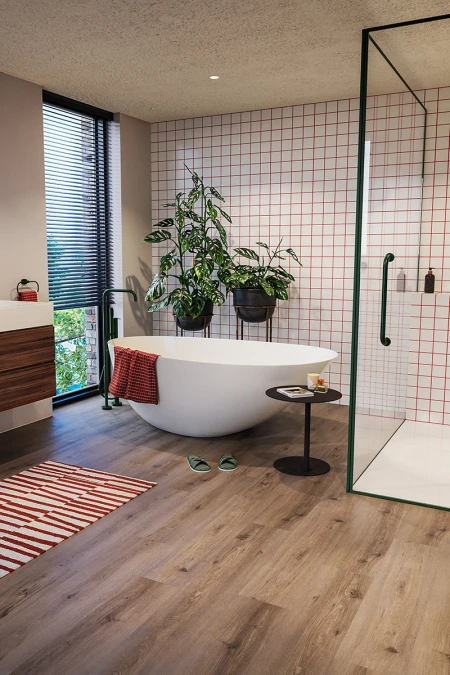Qual è il pavimento migliore per il tuo bagno? Le piastrelle in ceramica sono belle e resistenti all'acqua, ma senza riscaldamento a pavimento risultano fredde al tatto. Il parquet, invece, è caldo e confortevole, ma purtroppo non regge bene all'umidità e agli sbalzi di temperatura. Con il vinile a incastro in bagno puoi invece combinare il meglio dei due mondi. Sotto una vasca da bagno indipendente, accanto alla doccia o vicino allo stendino dove gli asciugamani bagnati sono appesi ad asciugare… Il vinile è ideale per ogni zona del bagno. E dato che puoi scegliere tra tantissime collezioni, troverai sicuramente un pavimento adatto al tuo bagno. Ancora meglio? Il vinile effetto parquet è adatto alla maggior parte dei tipi di riscaldamento a pavimento ed è molto facile da mantenere!