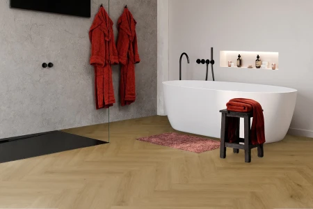 Un tocco di eleganza in bagno? Nessun problema con Parquetvinyl. Con un pavimento in vinile a spina di pesce trasformi la tua routine in bagno in un momento di lusso e benessere. Una sensazione calda e piacevole sotto i piedi e una finitura di pregio? C'è.