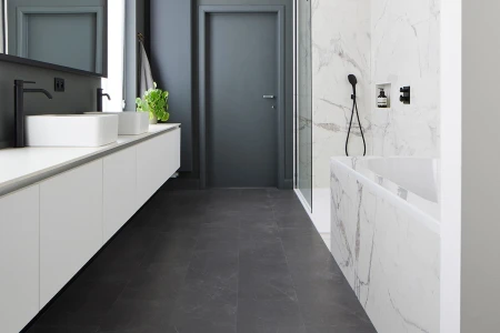 Il bagno è il luogo in cui inizi e concludi la giornata, dove vai per rinfrescarti o semplicemente per rilassarti completamente. Per permetterti di arredare questo spazio proprio come desideri, ti offriamo un'ampia gamma di opzioni per i nostri pavimenti in vinile.