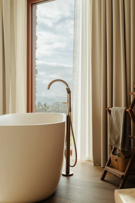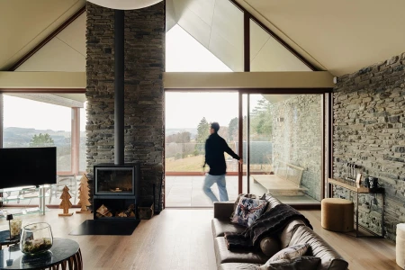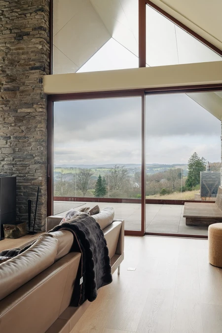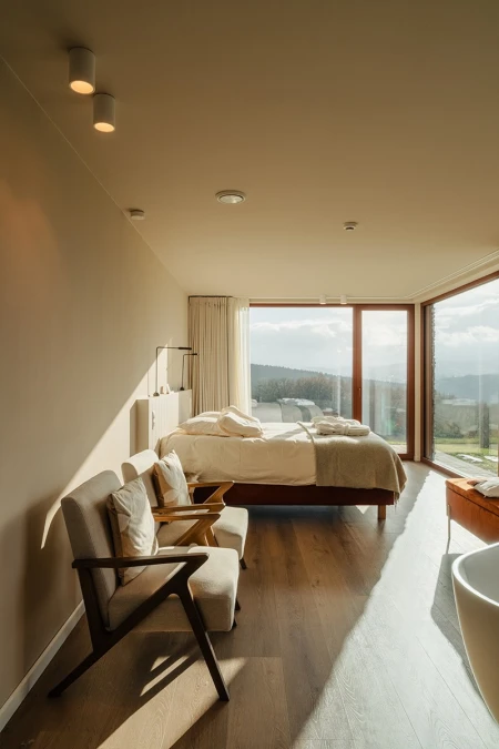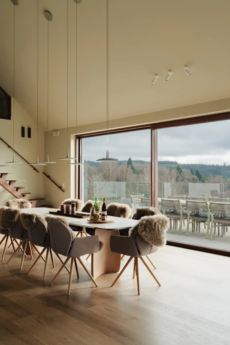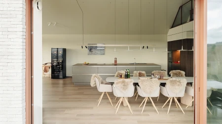 All'arrivo si nota immediatamente la vista mozzafiato. Grazie alle ampie vetrate, il paesaggio panoramico entra all'interno come un quadro vivente. Si è scelto consapevolmente un layout aperto, in modo che la luce e lo spazio siano al centro dell'attenzione. Ogni dettaglio degli interni rafforza quella sensazione di armonia con la natura.