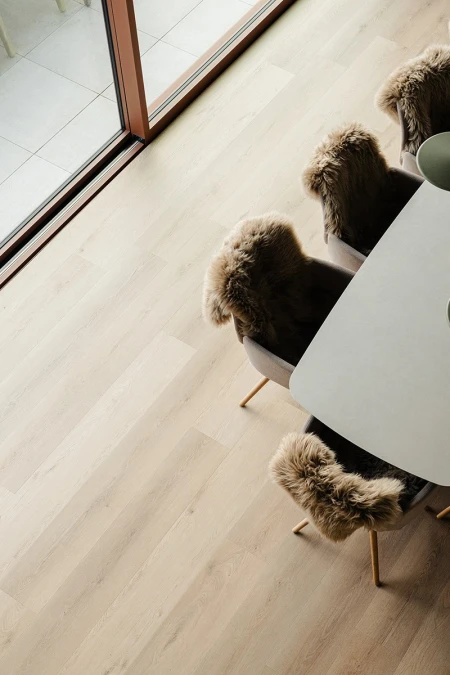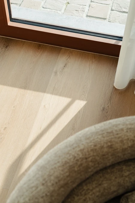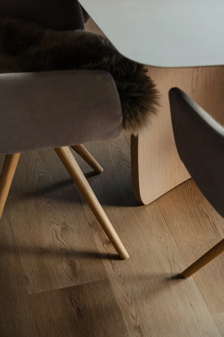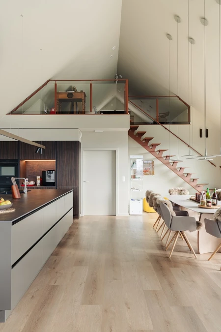 Per la finitura del pavimento è stato scelto il Parquetvinyl. Una decisione che si adatta perfettamente al concetto della casa sia dal punto di vista estetico che pratico. L'aspetto naturale del legno conferisce calore agli spazi moderni, mentre le caratteristiche di facile manutenzione sono ideali per una casa vacanze utilizzata intensamente. Il risultato? Un pavimento che non solo è bello da vedere, ma anche resistente alla vita quotidiana.